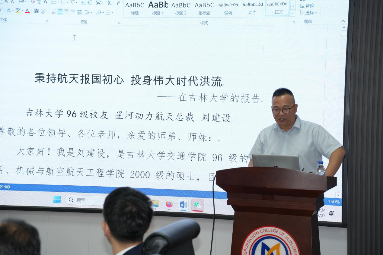 仪式结束后,刘建设校友为交通学院本科及研究生代表做了《秉持航天报国初心,投身伟大时代洪流》励志报告,分享了学习、工作以及创建星河动力的历程,鼓励同学们心怀“国之大者”,既要夯实学业基础,又要以'钉钉子精神'提升自身能力,用青春汗水浇筑科技创新高原的基石,用专业所学支撑交通强国与航天强国建设的巍峨大厦!