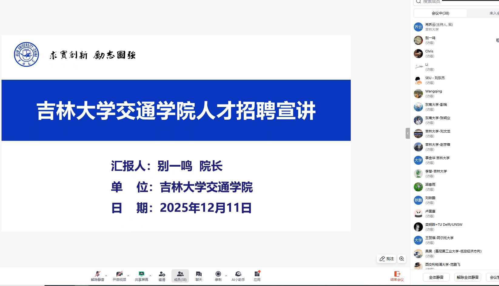为深入实施人才强院战略,构筑海内外优秀人才蓄水池,交通学院于2025年12月11日下午成功举办了线上人才招聘宣讲会。本次宣讲会通过腾讯会议平台进行,吸引了来自海内外40余位青年学者云端相聚,共话发展。会议旨在全面展示学校的综合实力、学院的发展愿景与求贤若渴的诚意,取得了良好成效。