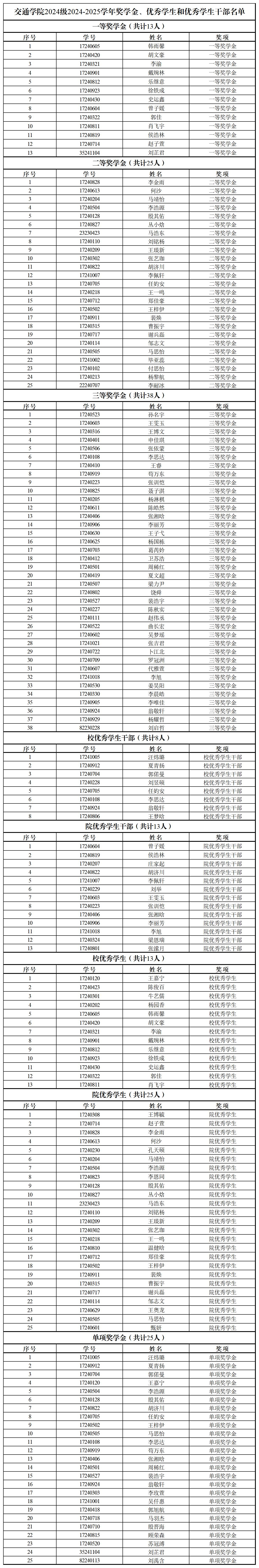 根据《吉林大学本科生学年奖学金评选办法》(校发〔2019〕382号)、《吉林大学优秀本科学生评选办法》(校发〔2019〕383号)、《吉林大学优秀本科学生干部评选办法》(校发〔2019〕384号)及党委学生工作部《关于开展2024-2025学年奖学金、优秀学生和优秀学生干部评选工作的通知》相关要求,经学生申请、学院评选工作小组讨论审定,拟确定交通学院2024级2024-2025学年奖学金、优秀学生和优秀学生干部名单如下: