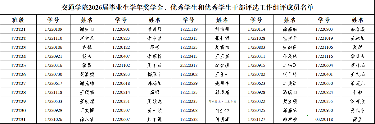根据党委学生工作部《关于开展2026届毕业生学年奖学金、优秀学生和优秀学生干部评选工作的通知》相关要求,交通学院按照班级为单位成立组评小组(小组成员一般由学生党员、学生干部、学生代表组成,总人数不少于5人,其中设组长1人)。现将2026届毕业生学年奖学金、优秀学生和优秀学生干部评选工作组评小组成员名单公布如下(各组评小组首位为组长)。